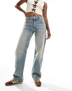 Mango Low Waist Straight Leg Jeans In Washed Light Blue For Women